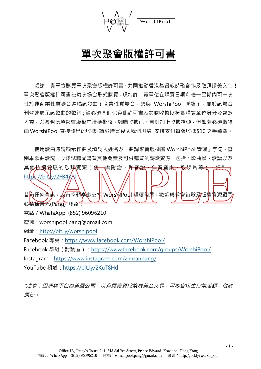 使用歌曲時請顯示作曲及填詞人姓名及「曲詞聚會版權屬WorshiPool管理」字句。請必須同時保存購買後的許可書並購買收據及紀錄以核實購買單位身分及會眾人數,以證明此項聚會版權申請獲批核。網購收據已可自訂加上收據抬頭,但如若必須取得由WorshiPool直接發出的收據,請於購買後與我們聯絡,安排支付每張收據港幣$10之手續費。
